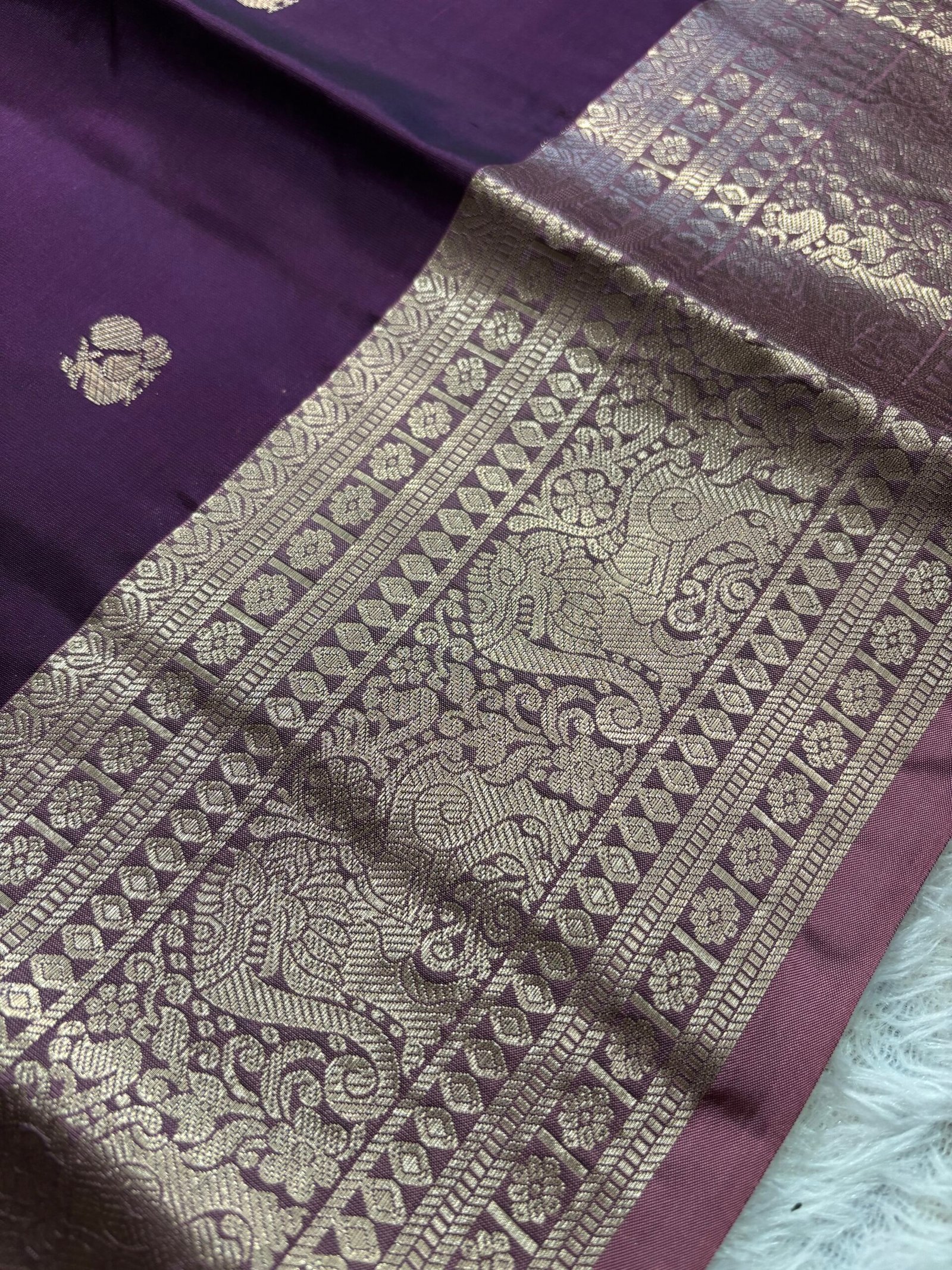 This pure kanchipuram soft silk saree having peacock butta in the body with beautiful contrast borders. Contrast rich pallu and blouse with borders.