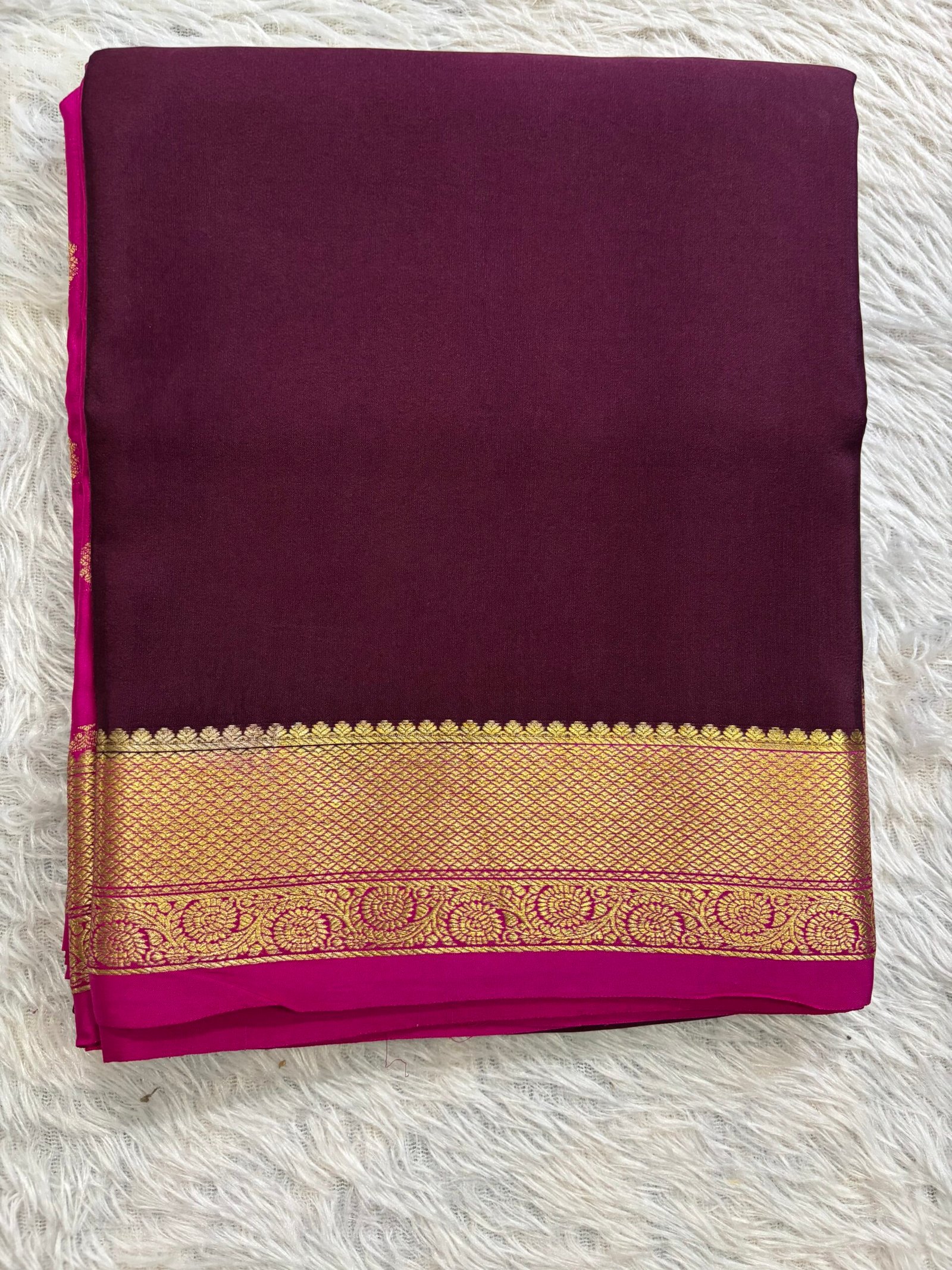 This Pure Mysore Crepe silk saree is a true masterpiece for your wardrobe. It showcases a plain body featuring a contrast partly pallu with motif patterns and contrast super rich pallu complementing with plain blouse.