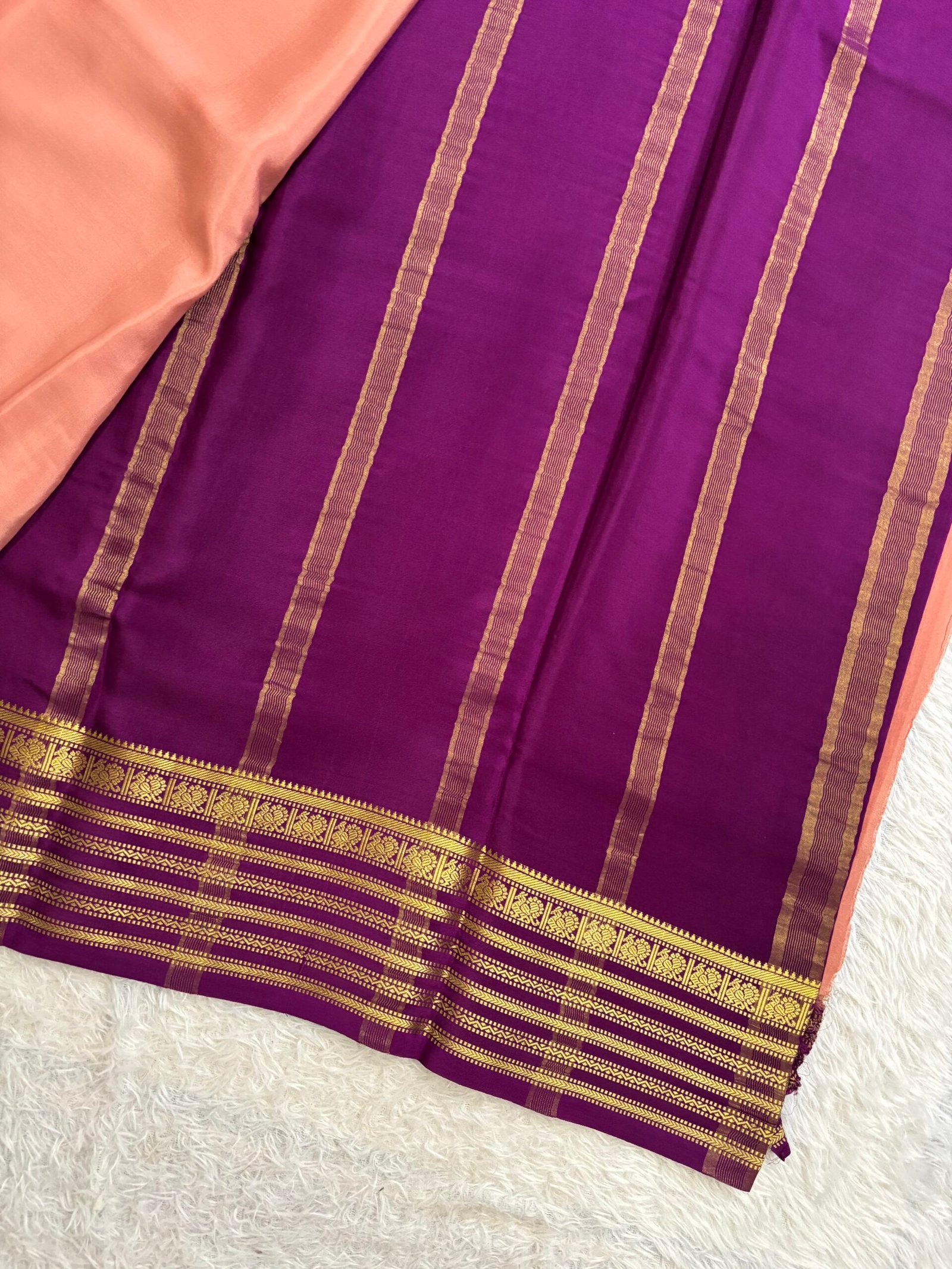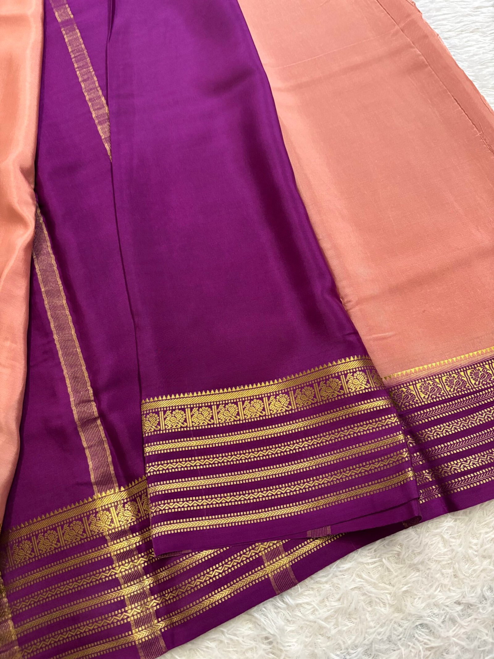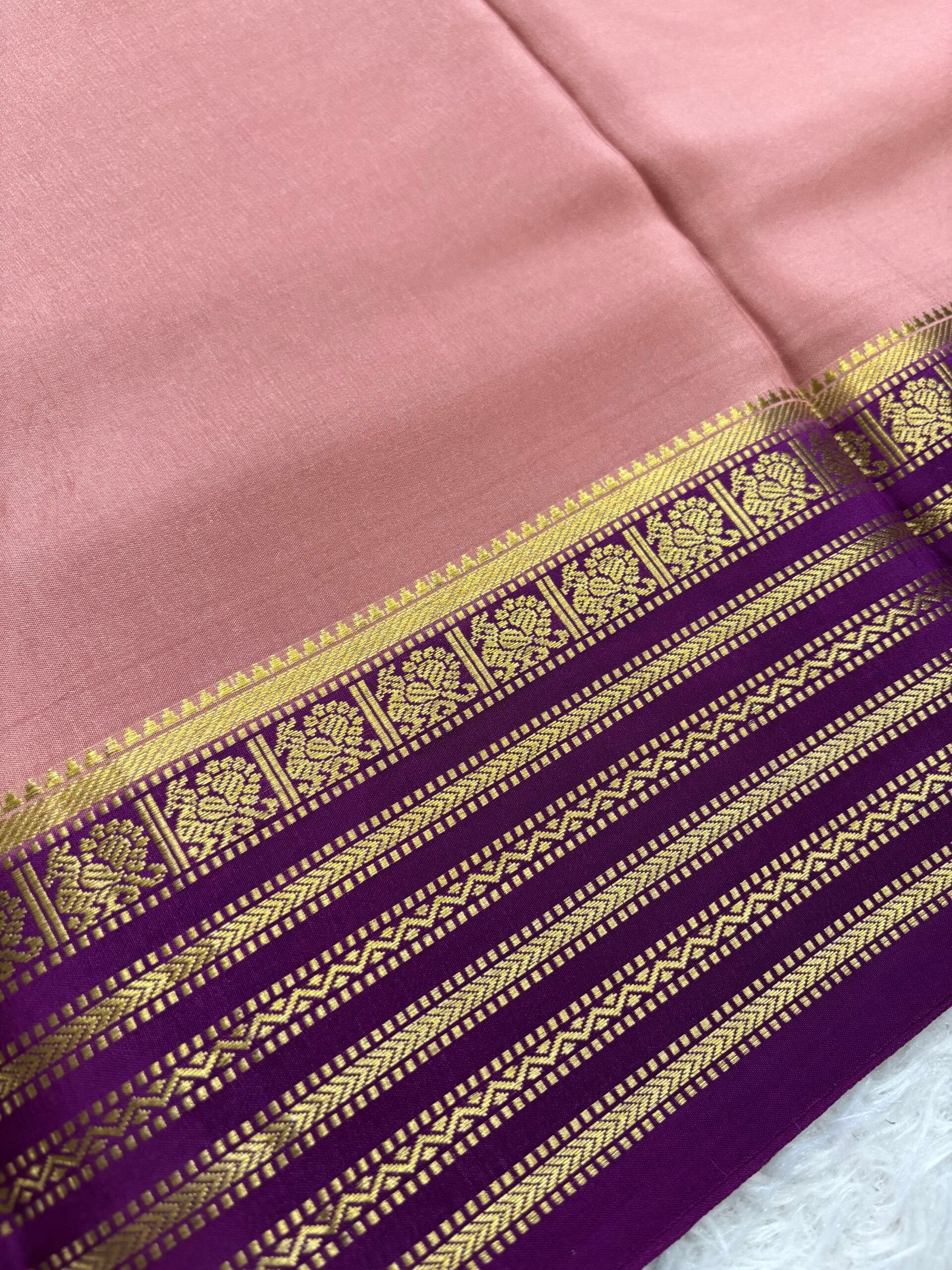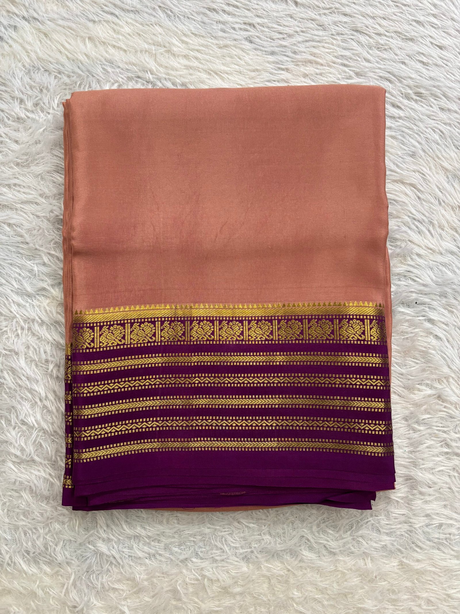 This Pure Mysore Crepe silk saree having plain body with contrast small peacock borders with contrast pallu and blouse adding a regal and sophisticated look which is ideal for special occasions.