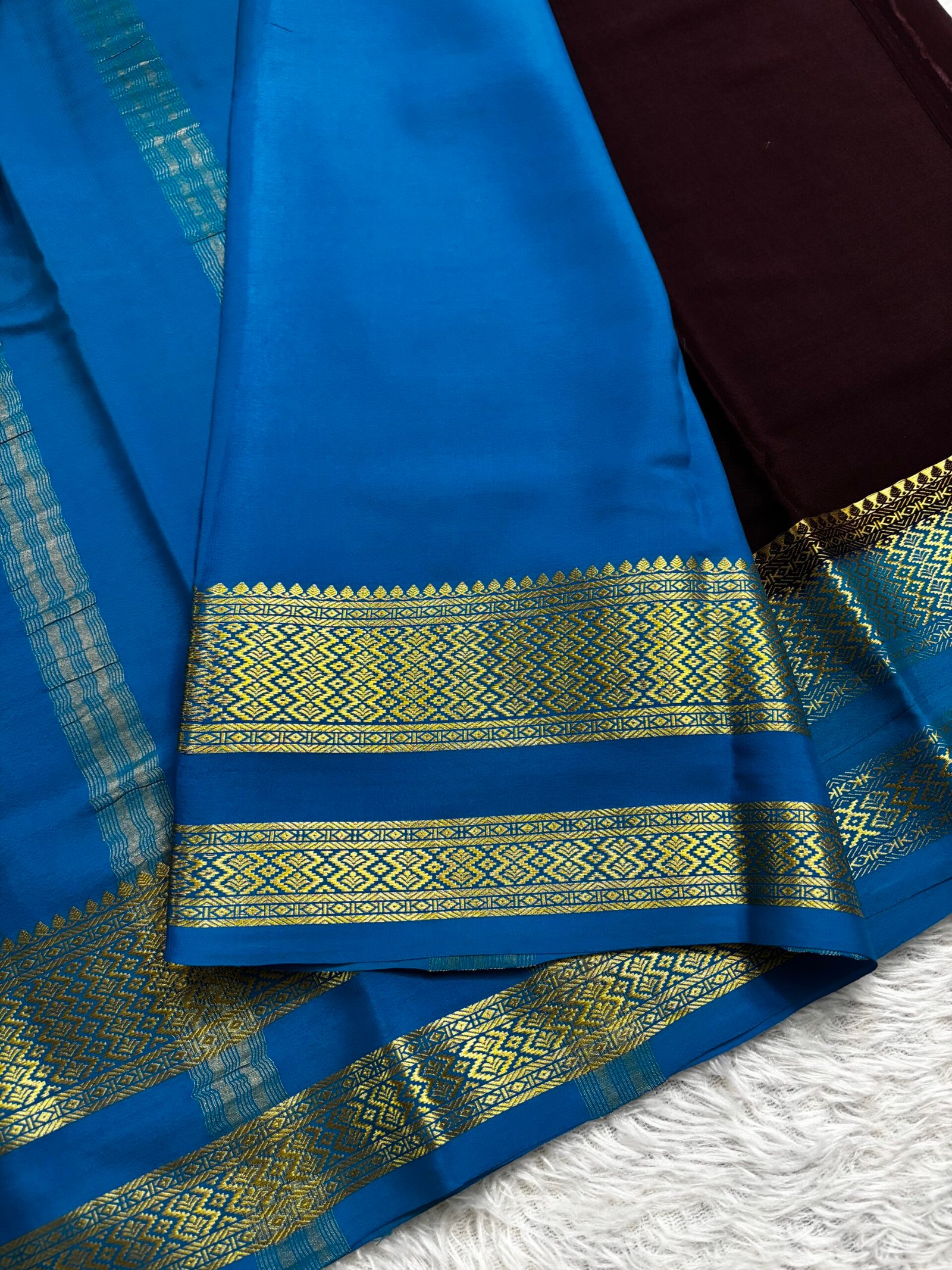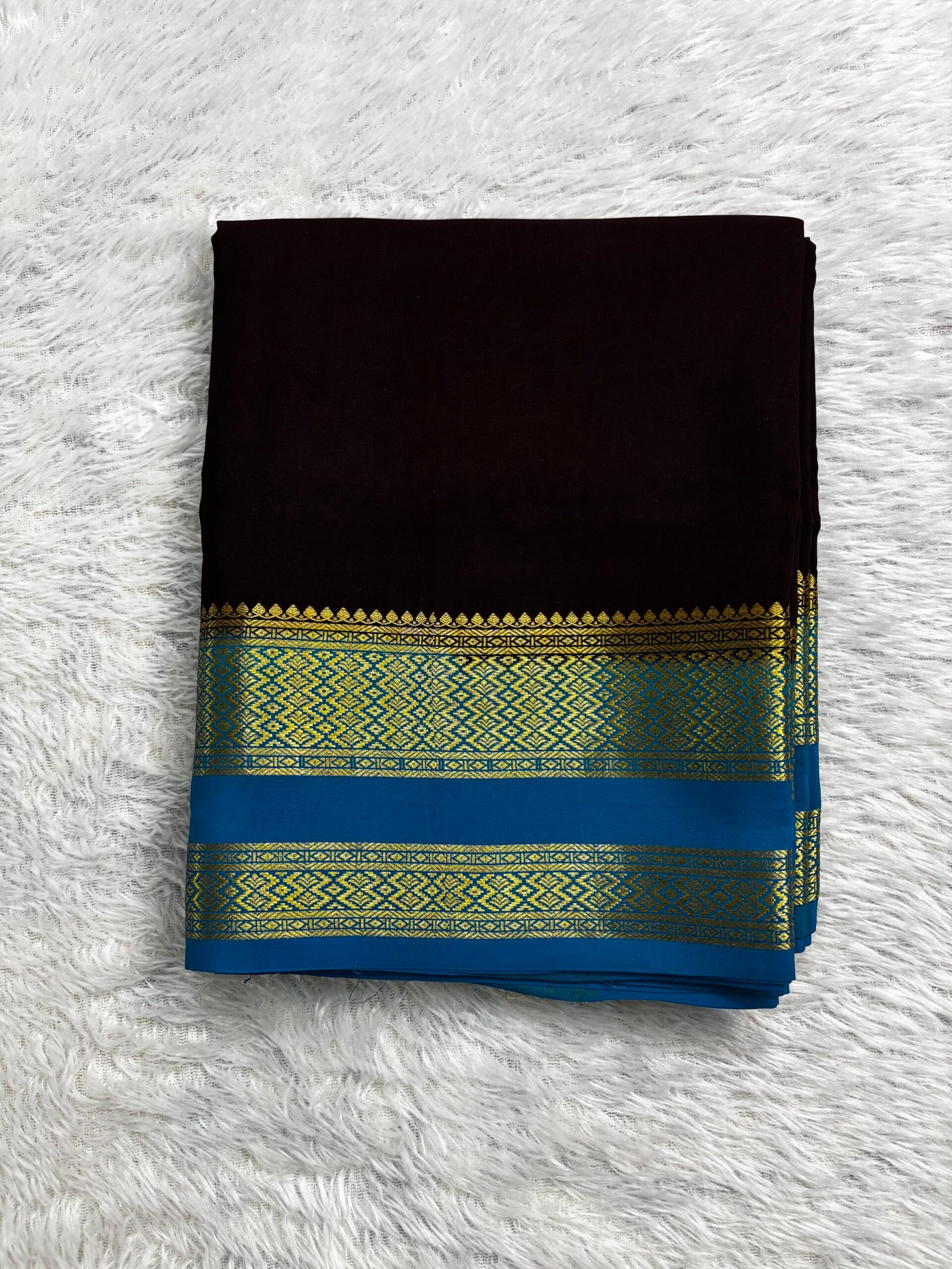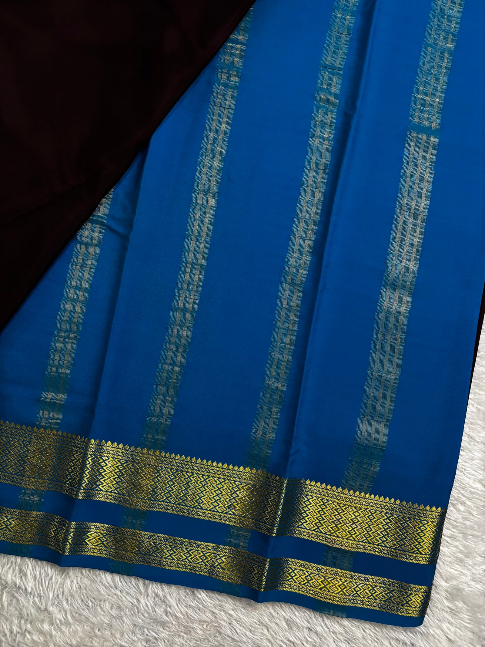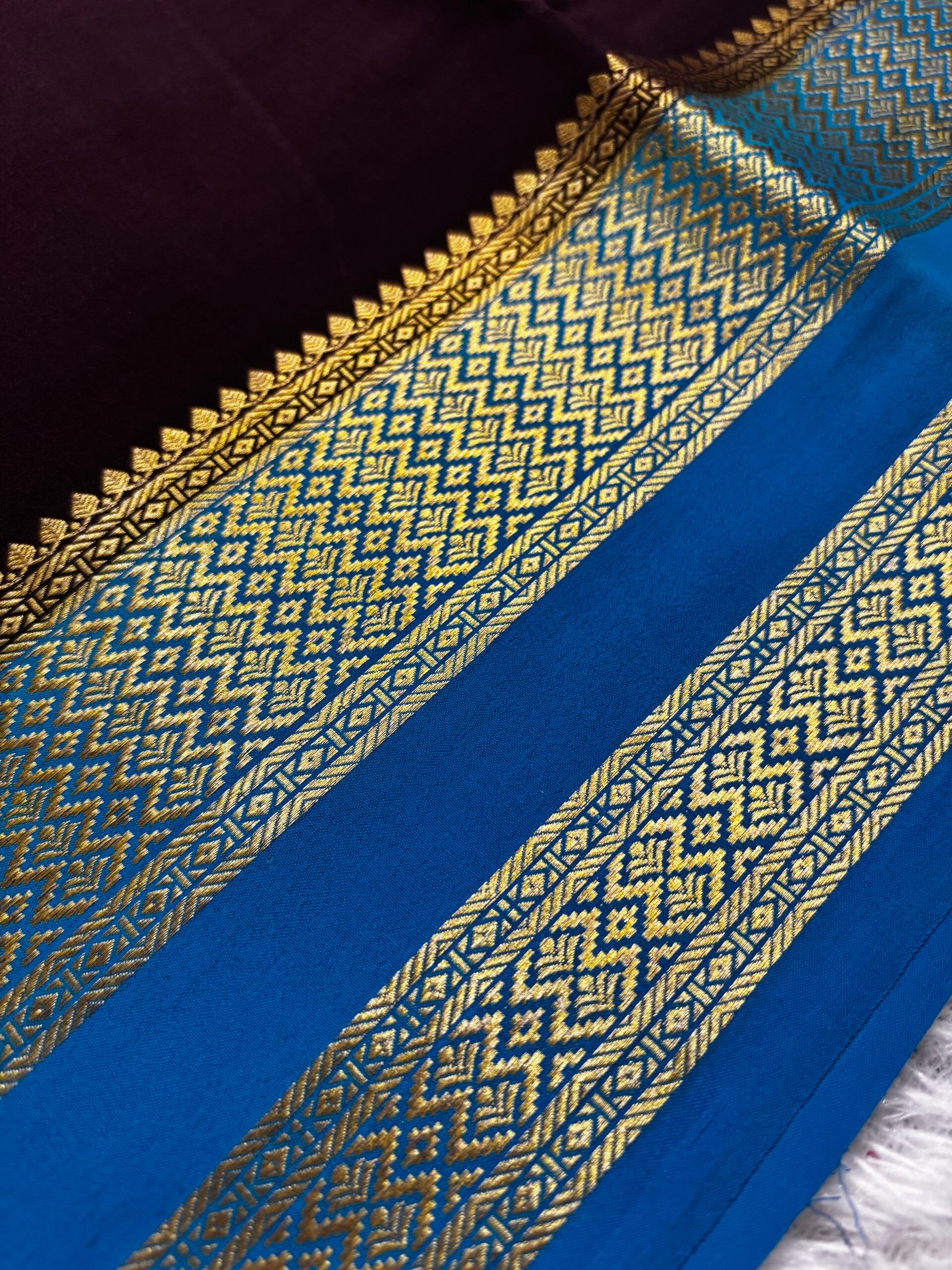 Step into the timeless elegance with this stunning color combination of Pure Mysore Crepe silk saree. This saree features a plain body complimented with a contrast double borders. This comes with a contrast line pallu and a blouse with borders..