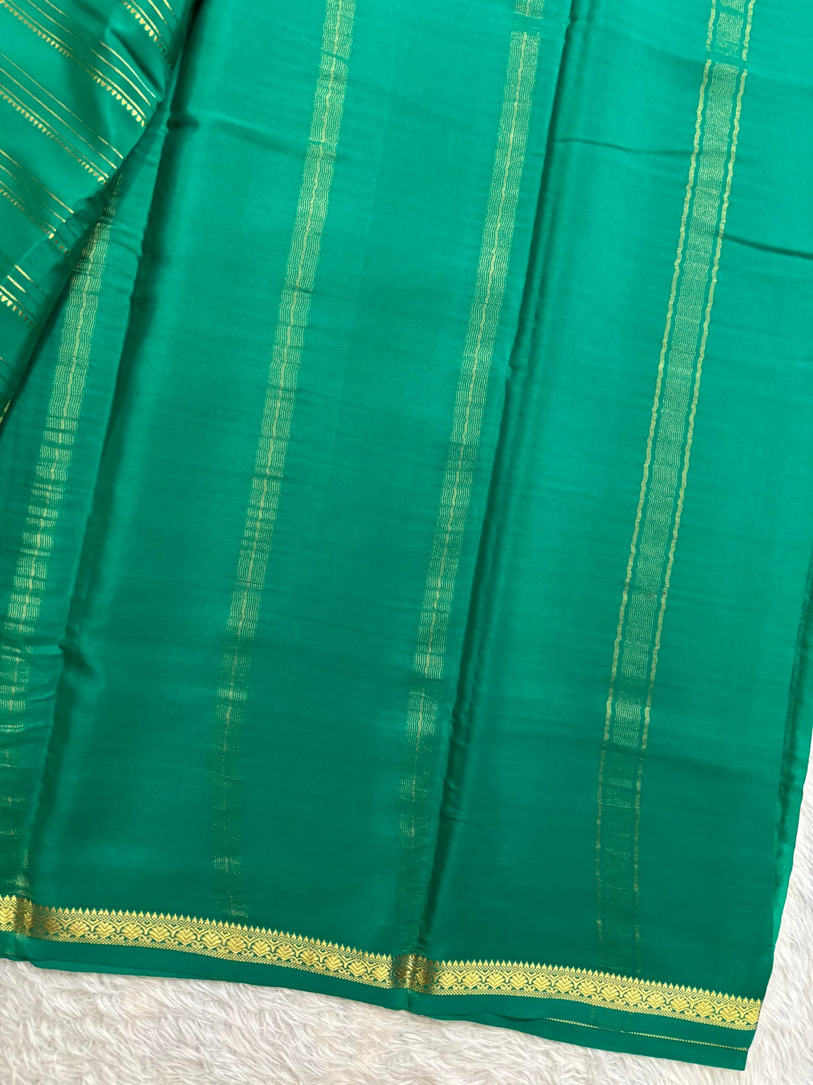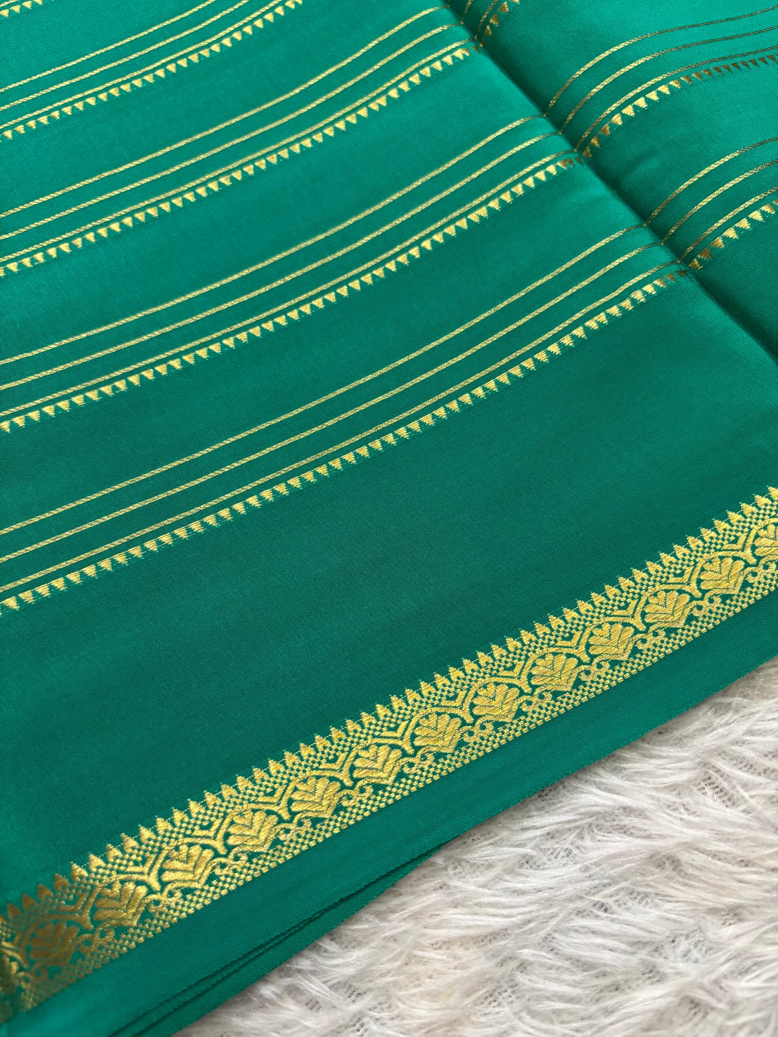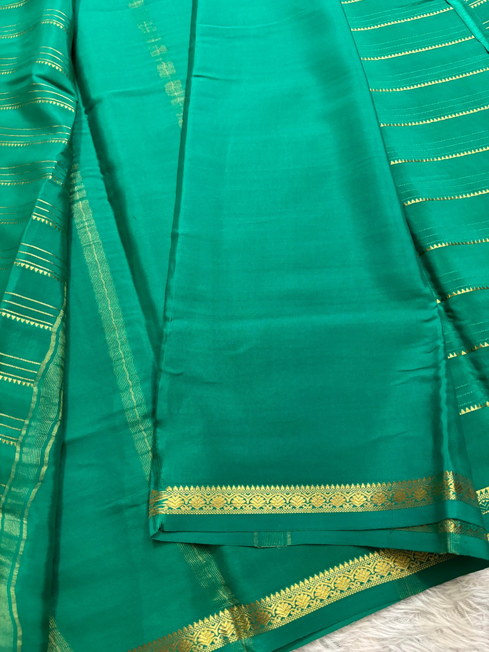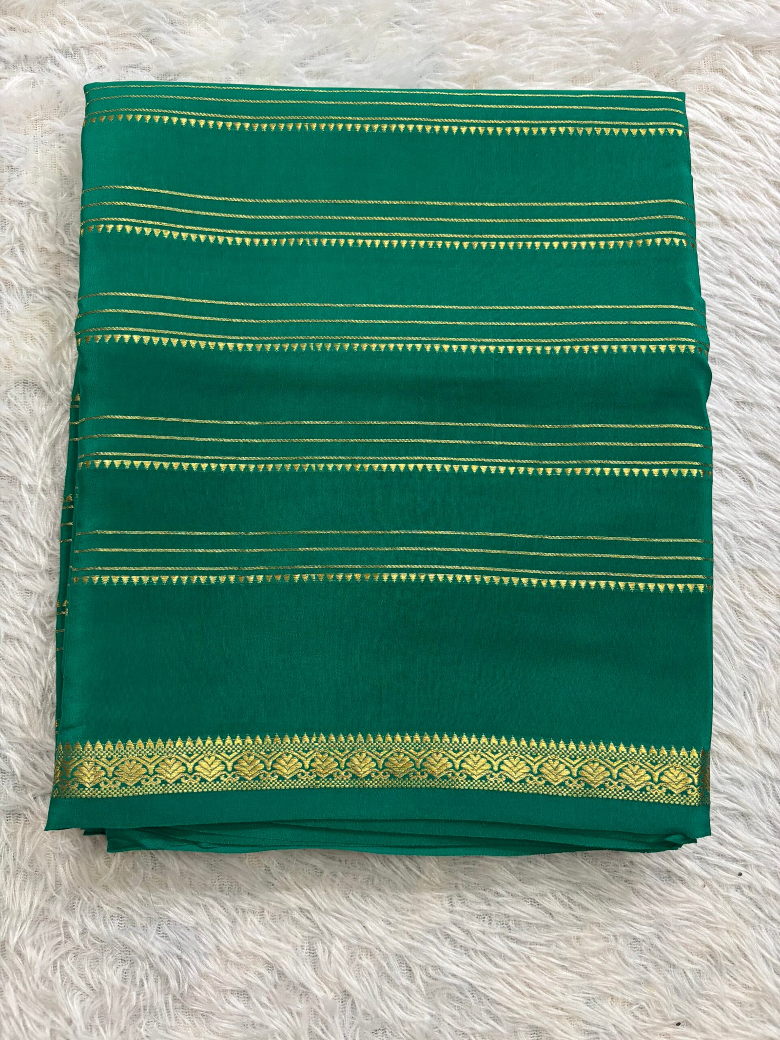 This Pure Mysore Crepe silk saree having beautiful horizontal patterns with small borders along with pallu and blouse is a perfect blend of classic simplicity with festive grandeur.