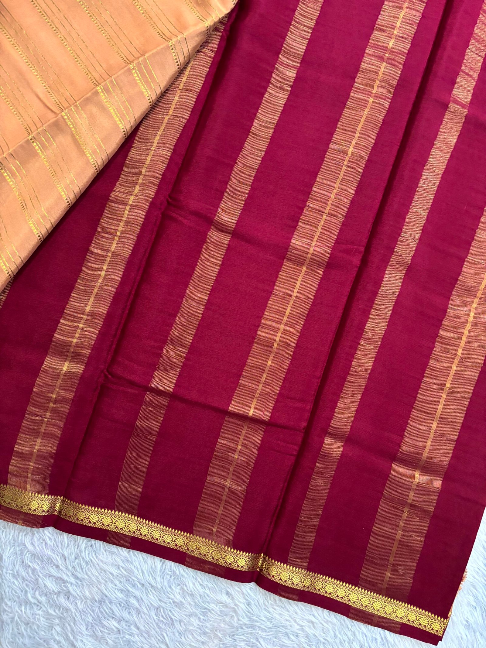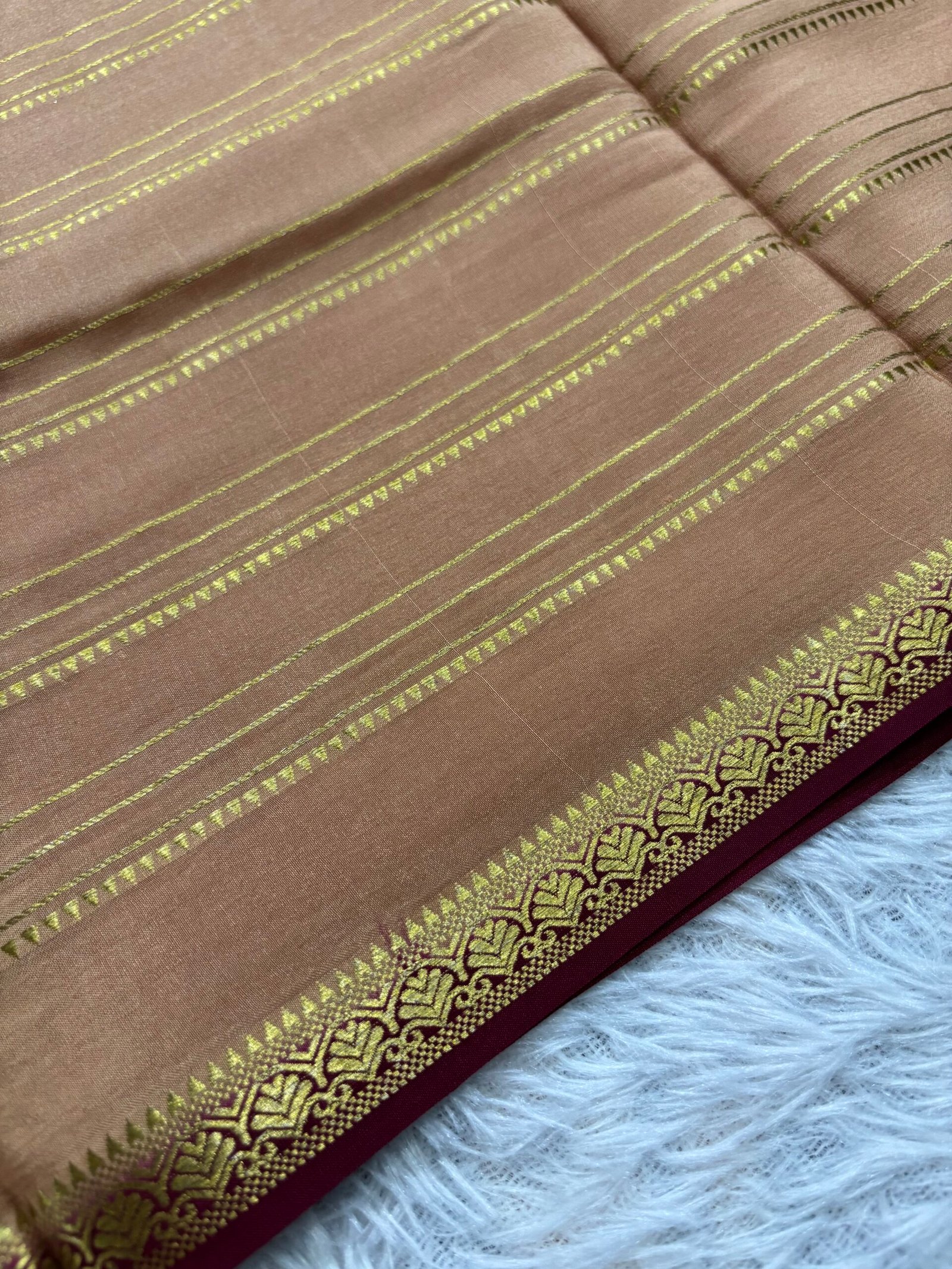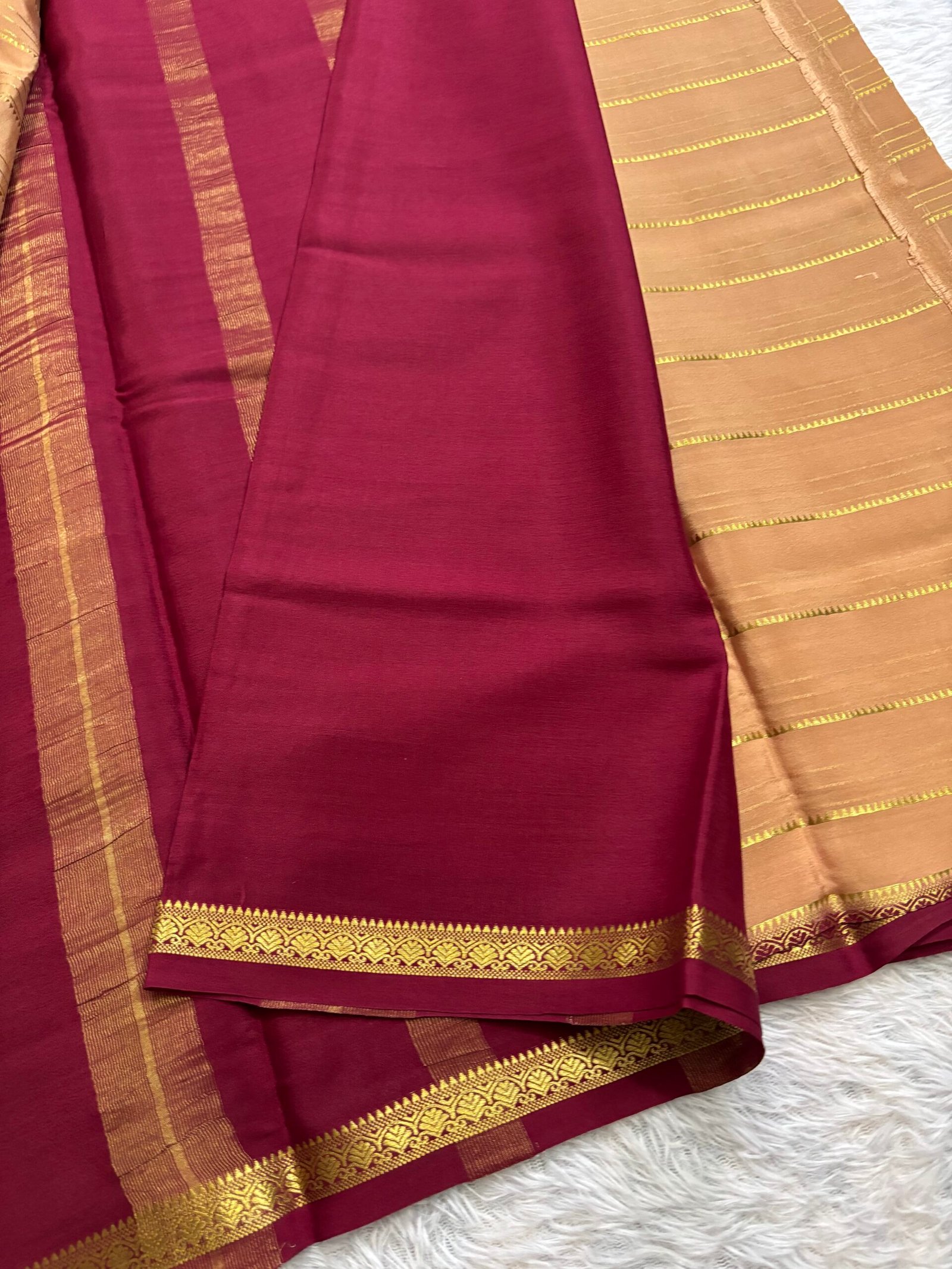 This Pure Mysore Crepe silk saree having beautiful horizontal patterns with small contrast borders along with contrast pallu and blouse is a perfect blend of classic simplicity with festive grandeur.