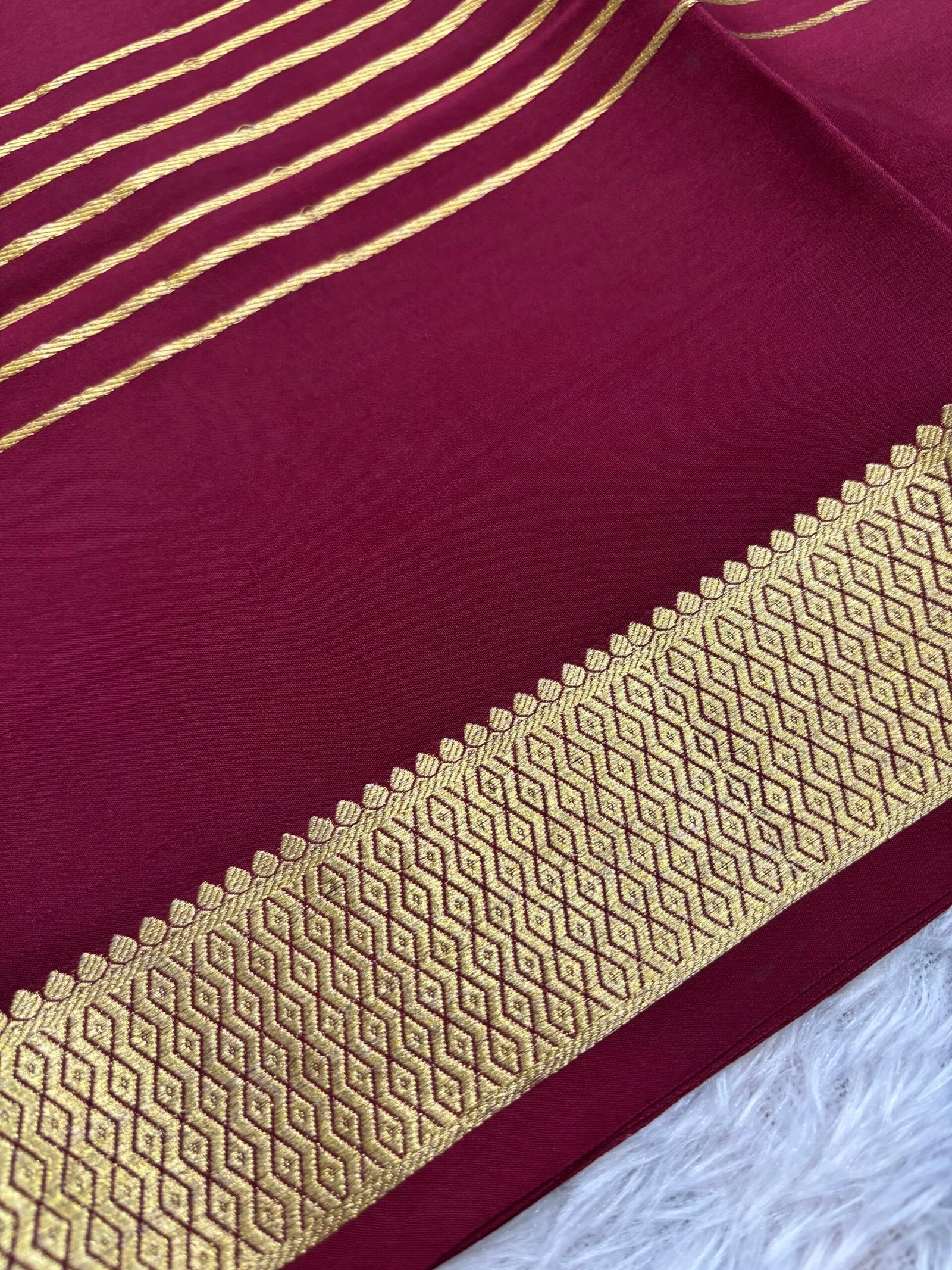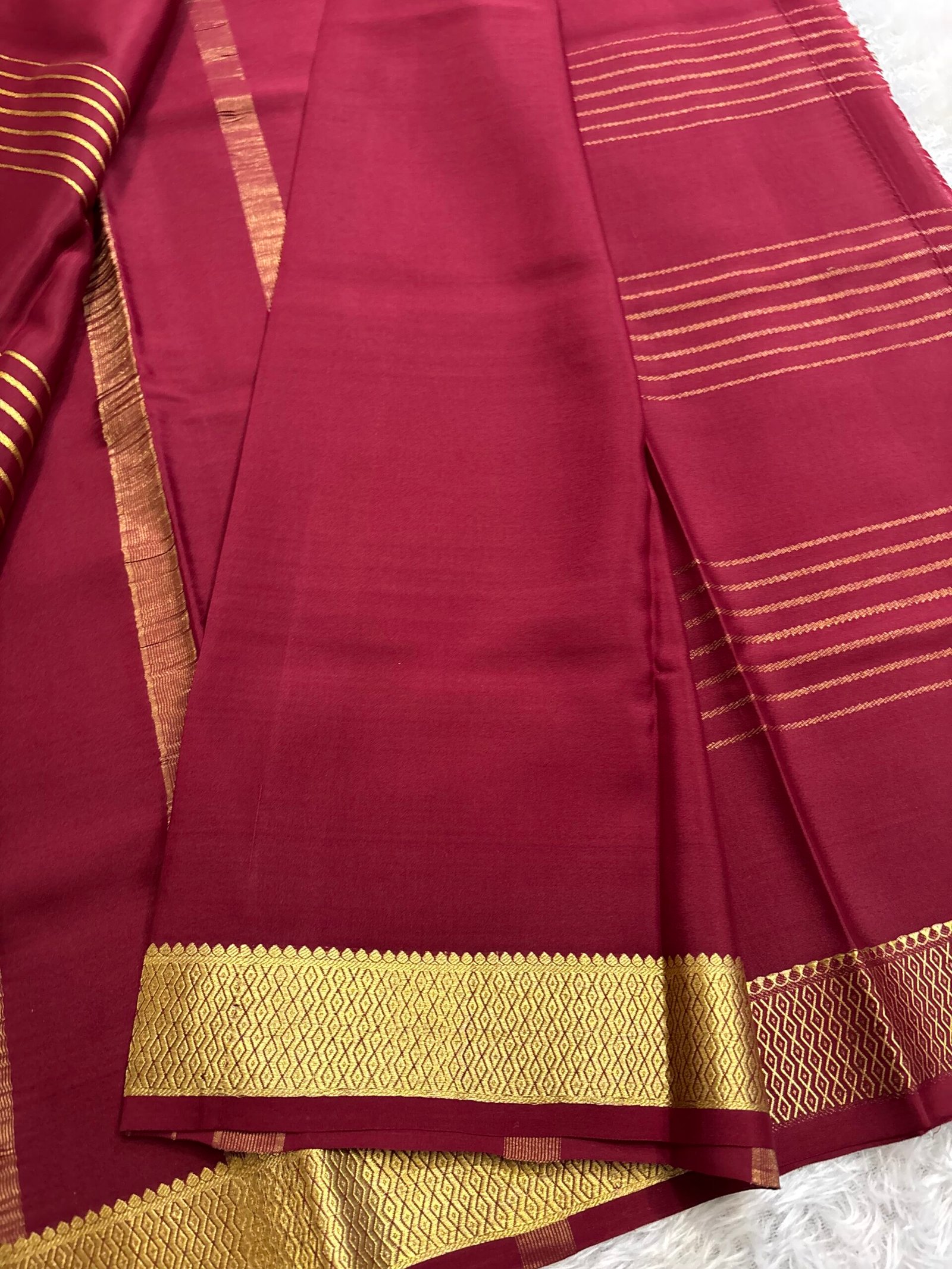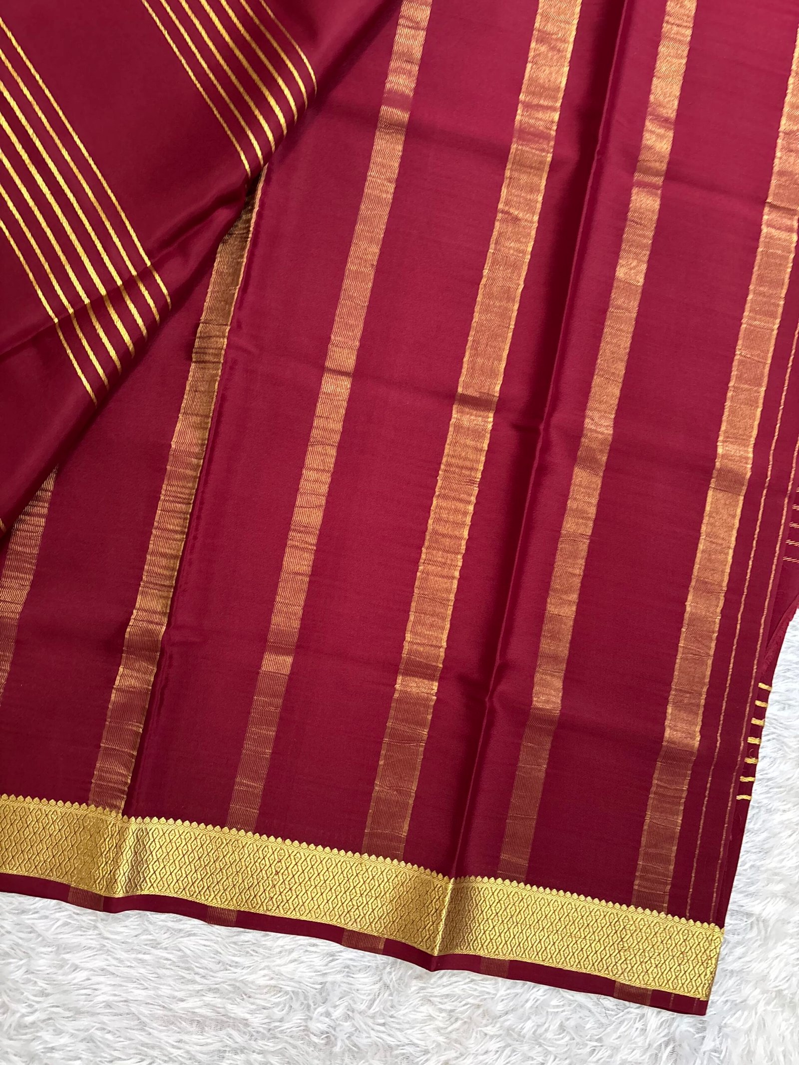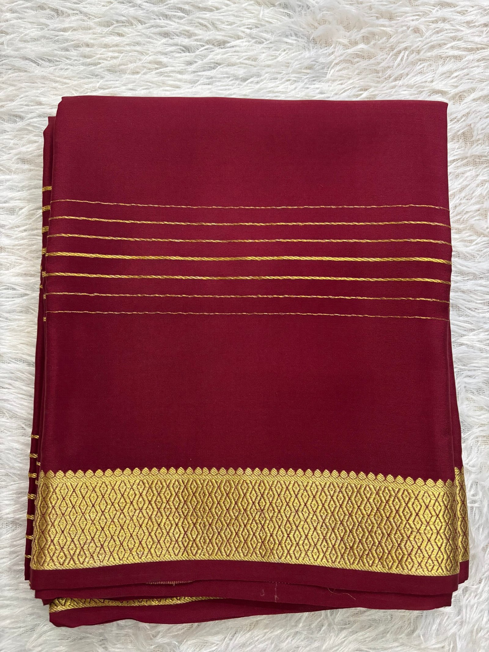 This exquisite Pure Mysore Crepe silk saree features a gold horizontal zari pattern gracefully adorning the saree. It is elegantly finished pallu and a matching blouse. This stunning piece promises to bring both comfort and grace, making it the perfect choice for any special occasion.