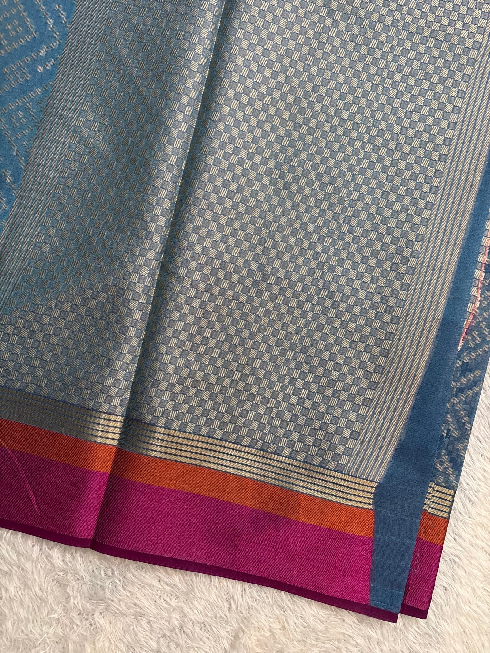 This Moonga Chanderi silk saree having beautiful geometric patterns allover the body with contrast borders. Rich pallu and brocade blouse.