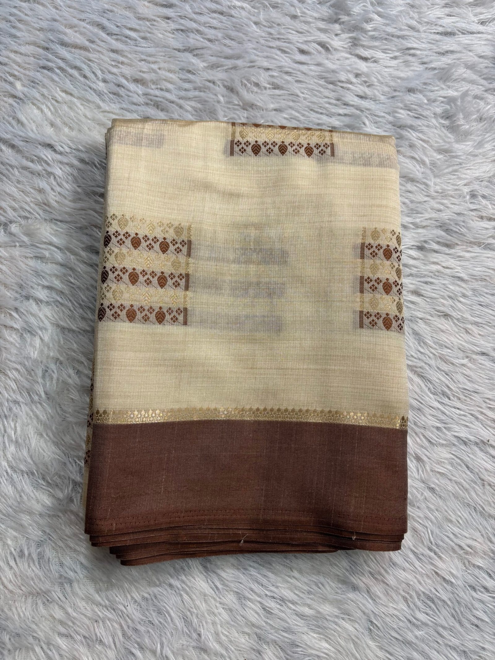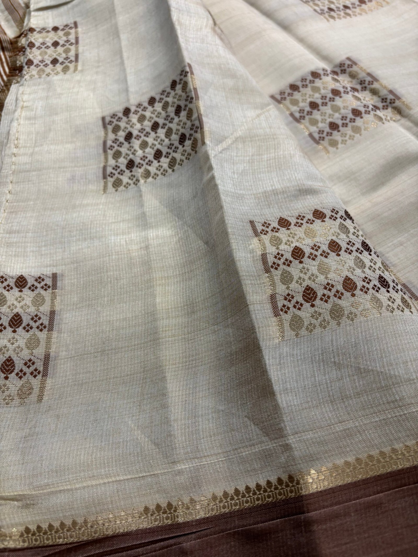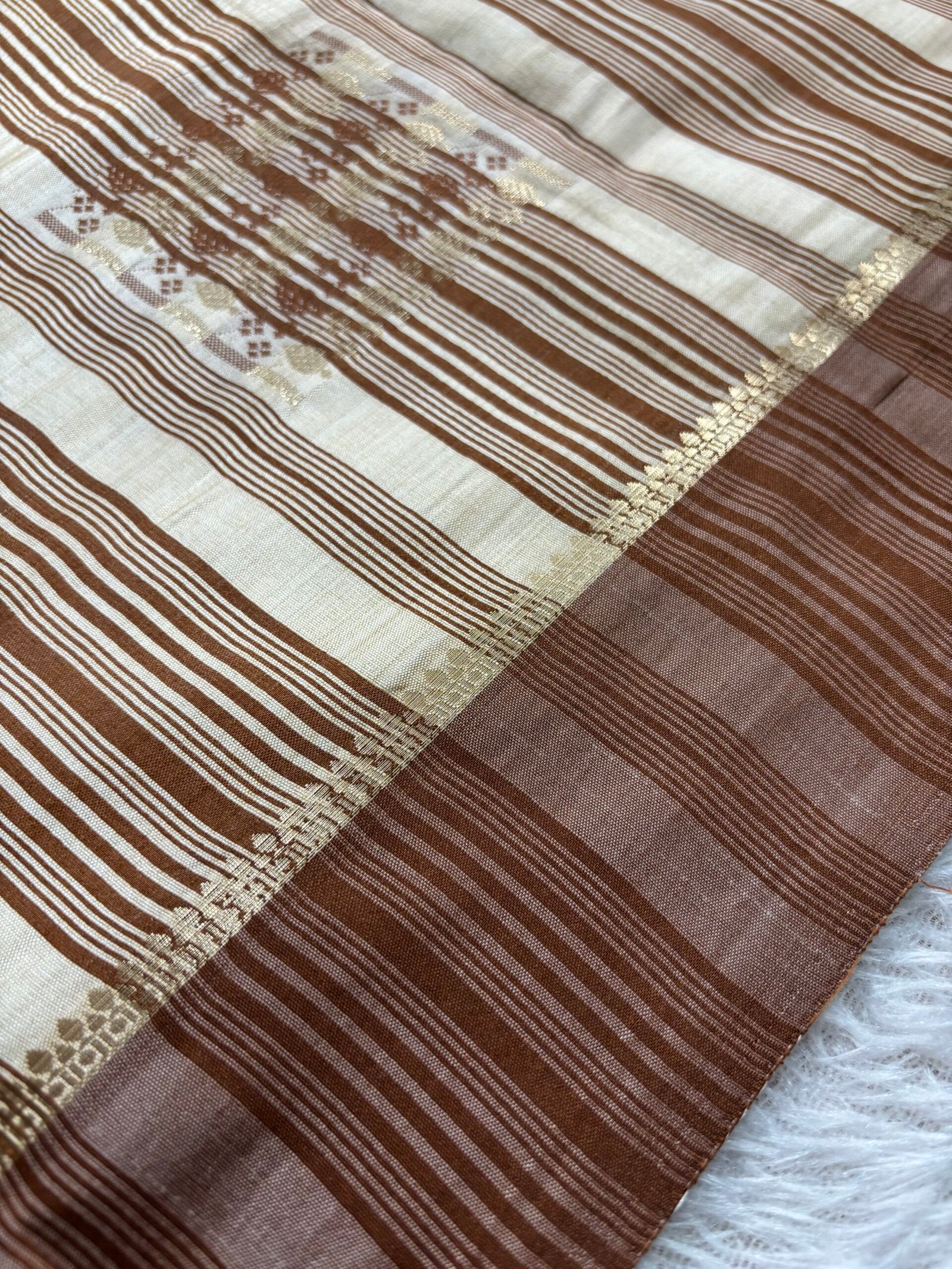 Semi Tussar silk saree having beautiful weavings in the body following with a contrast dual shaded simple borders. Contrast vertical stripes with a design weaving in the pallu pairing with a blouse same as body.