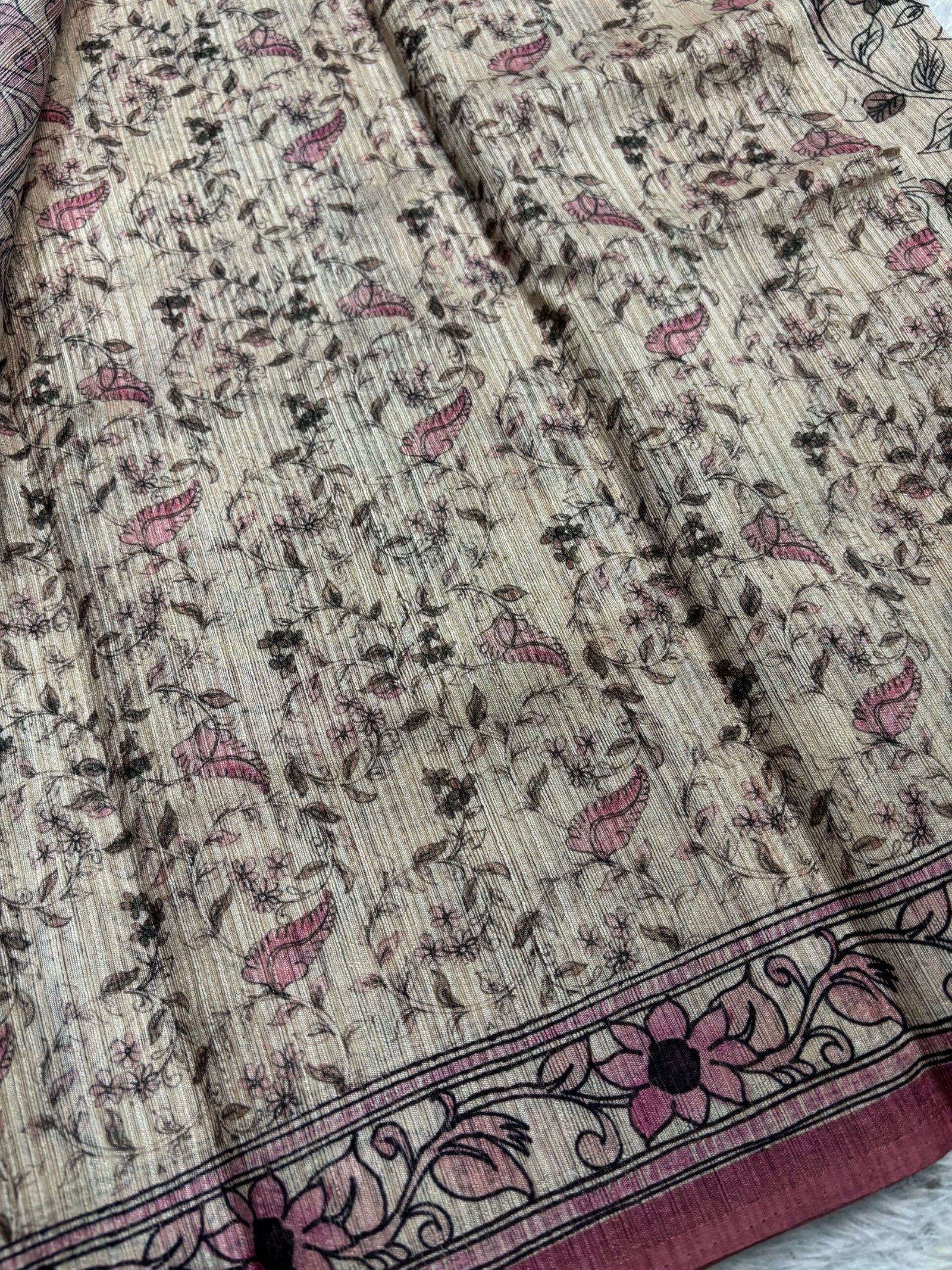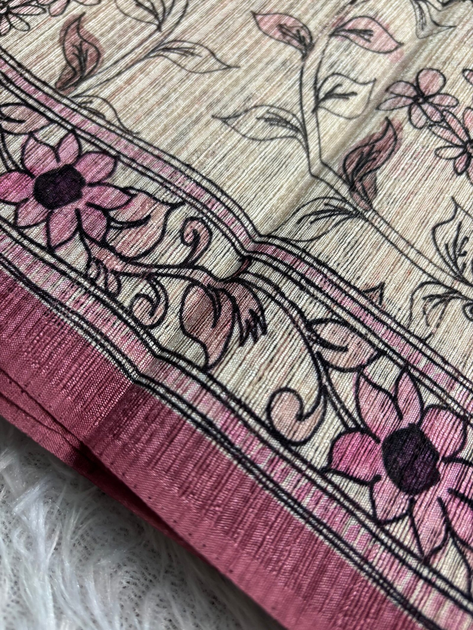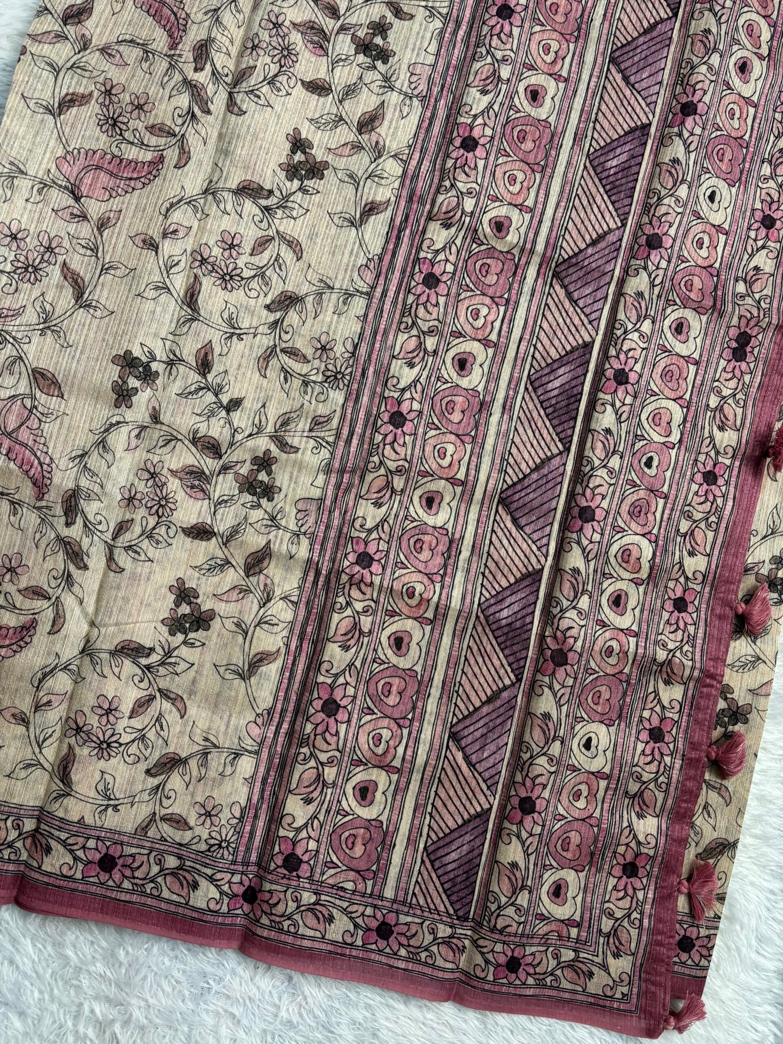 Bagalpuri cotton saree having pen kalamkari prints all over the body with pallu, tassels and printed blouse.