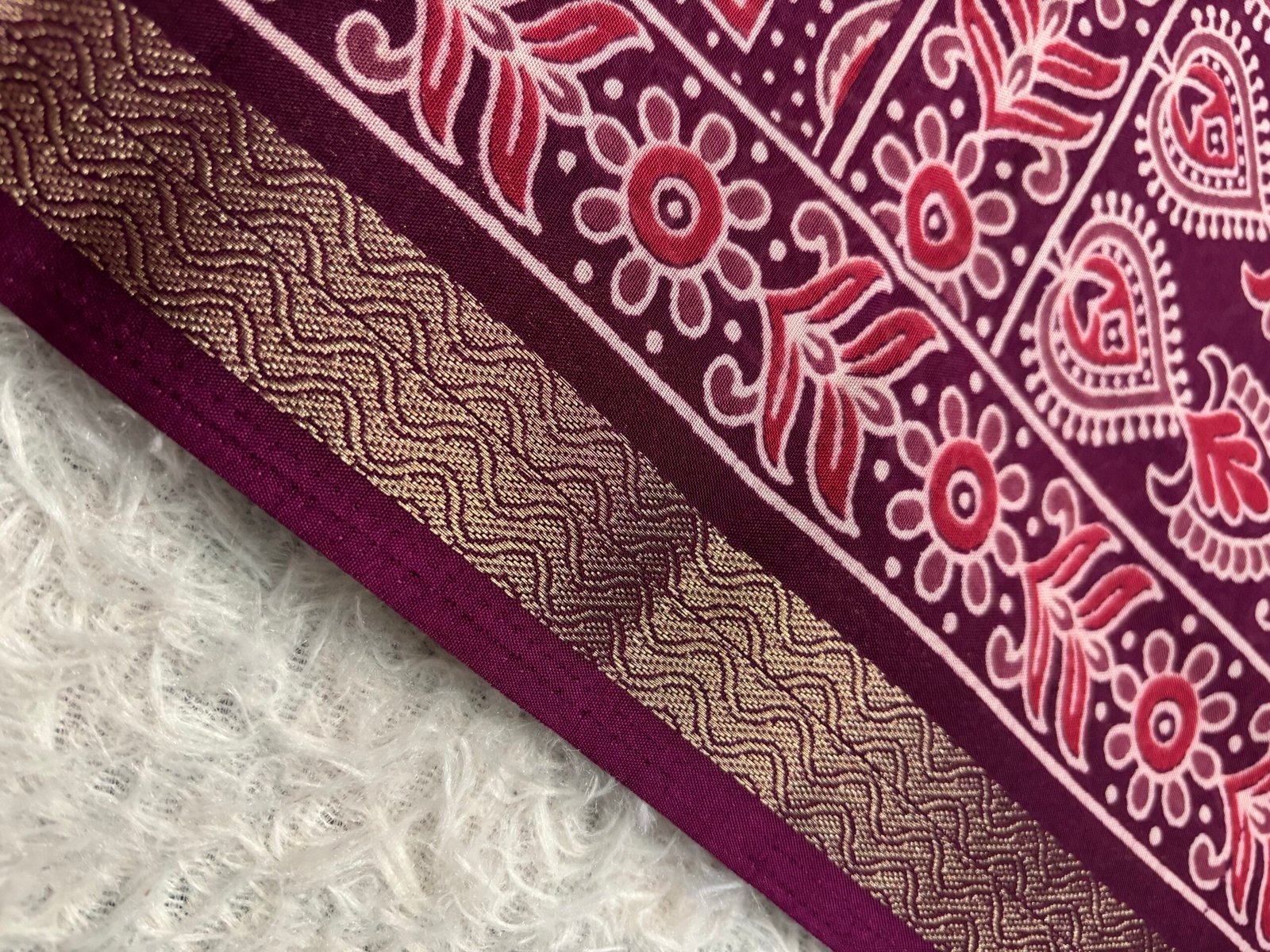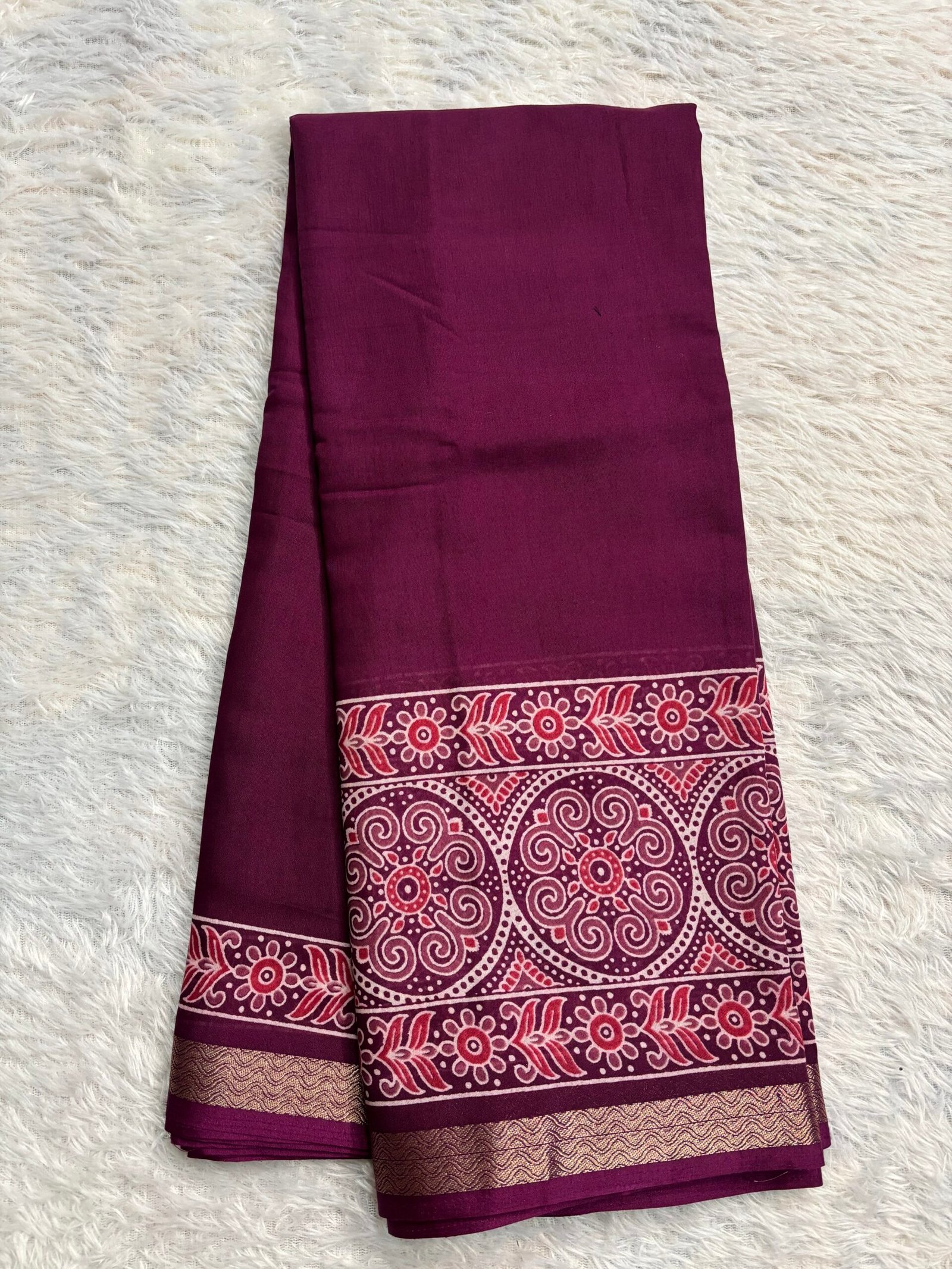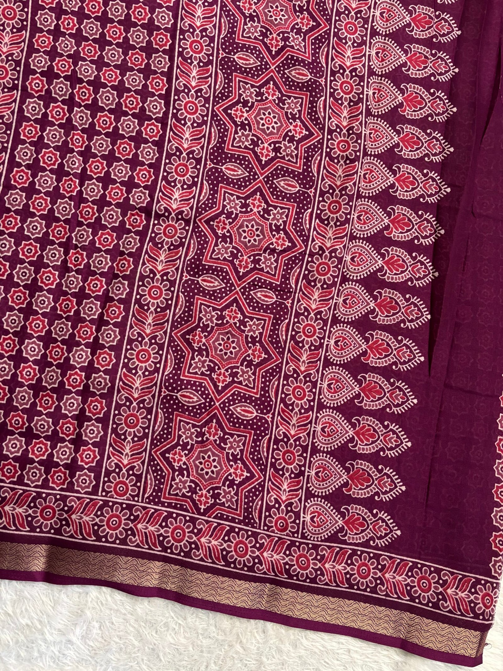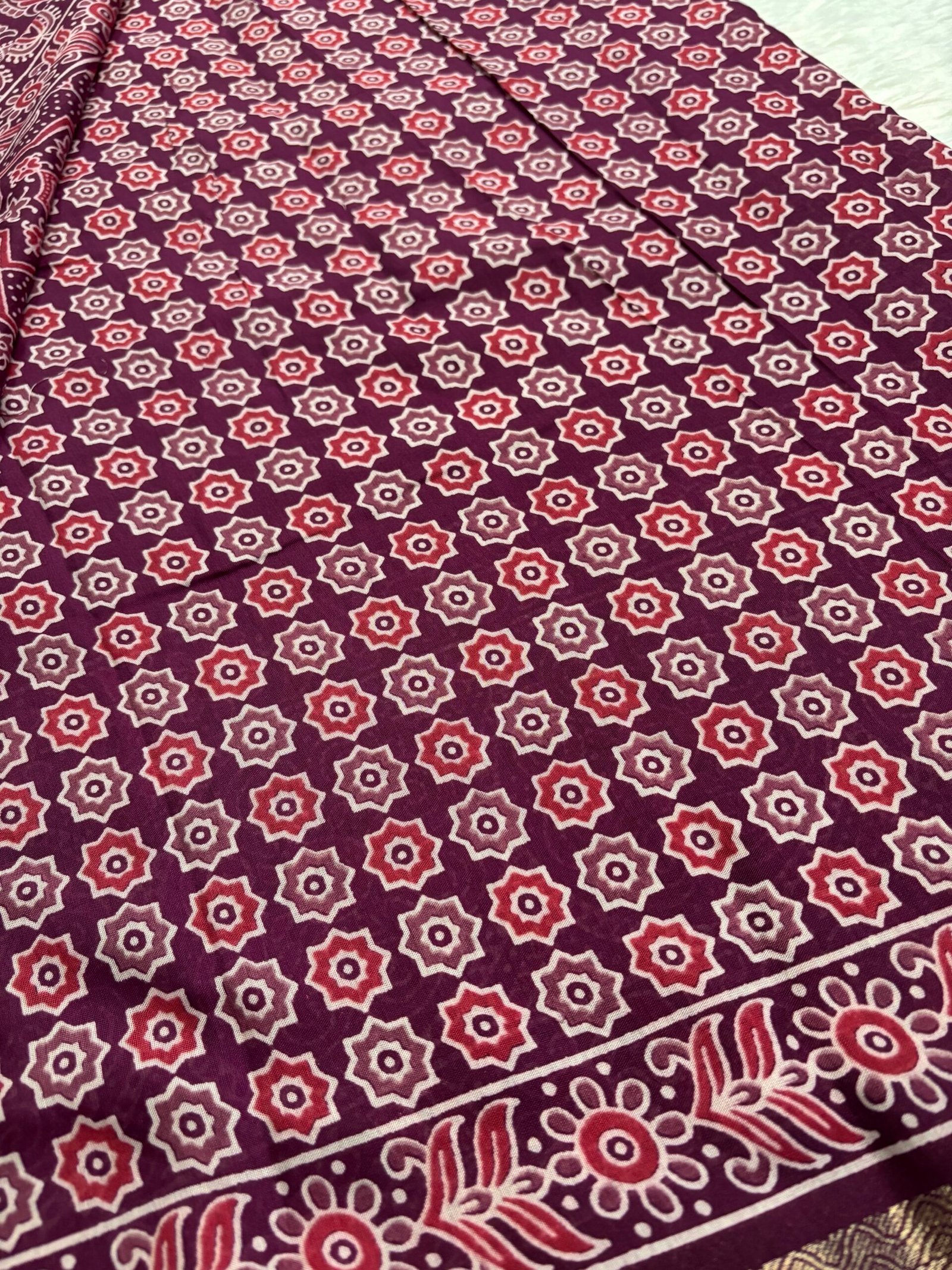 Mul Cotton saree with Ajrakh prints towards the border with beautiful pallu and blouse with prints.