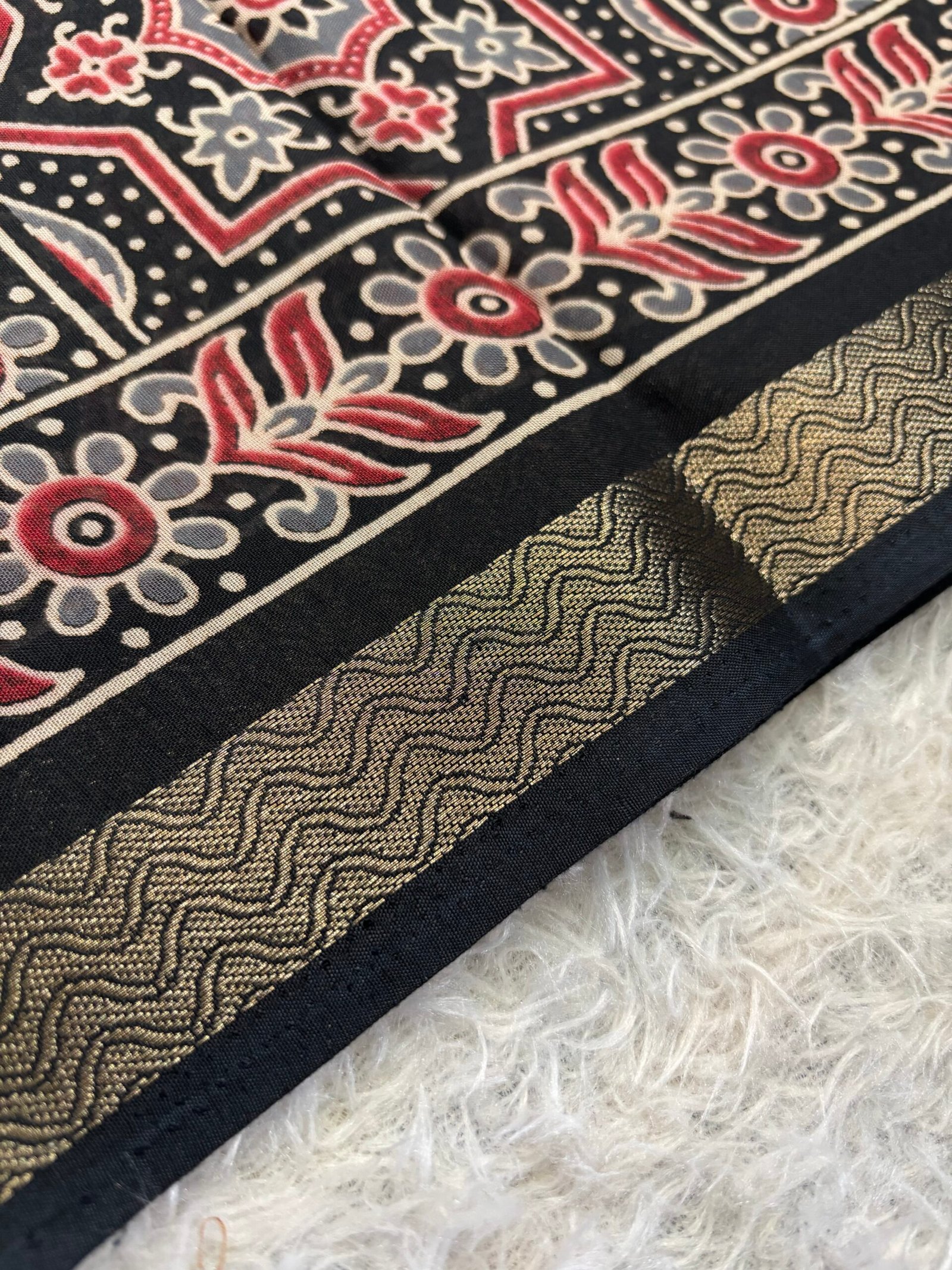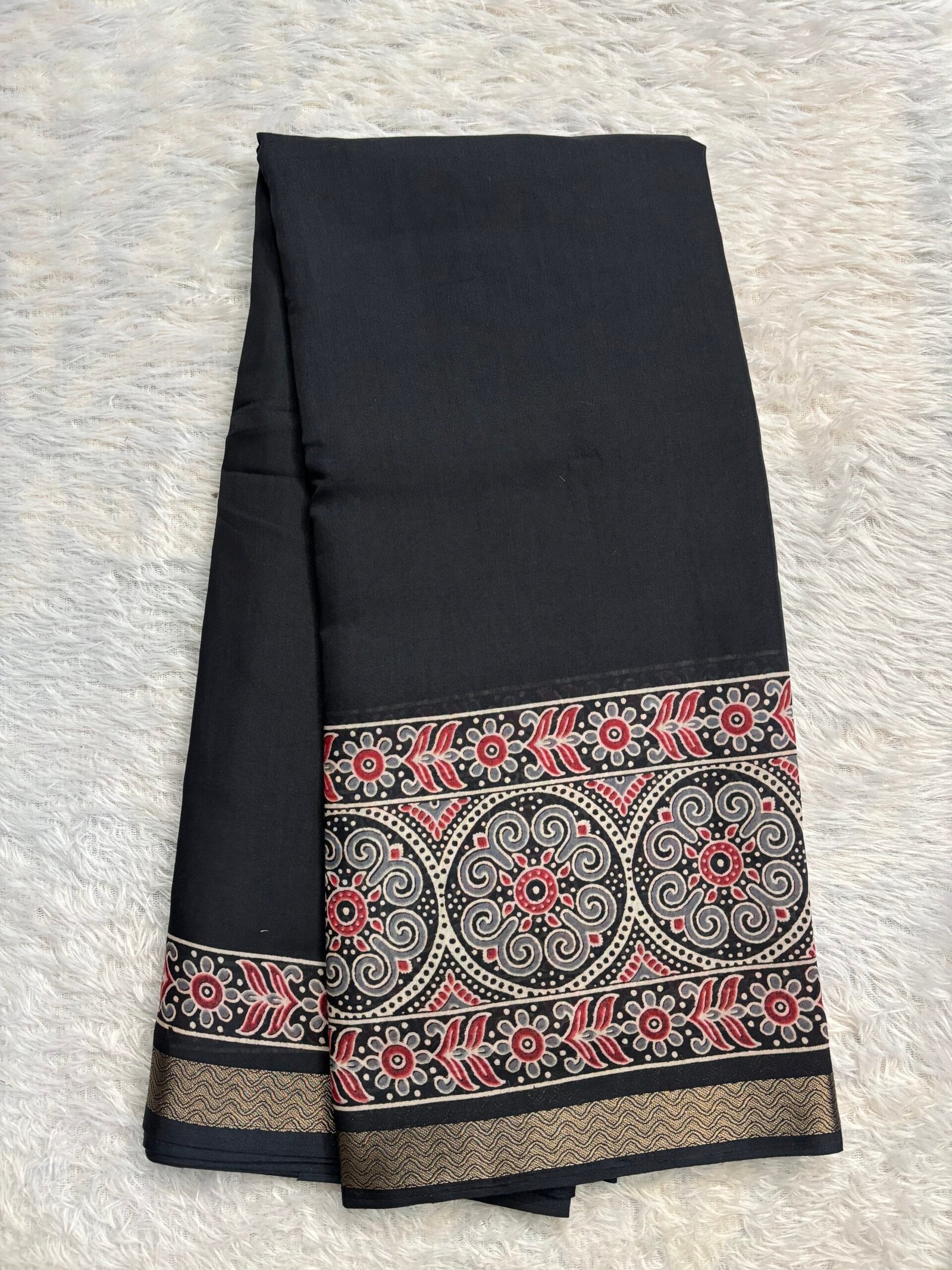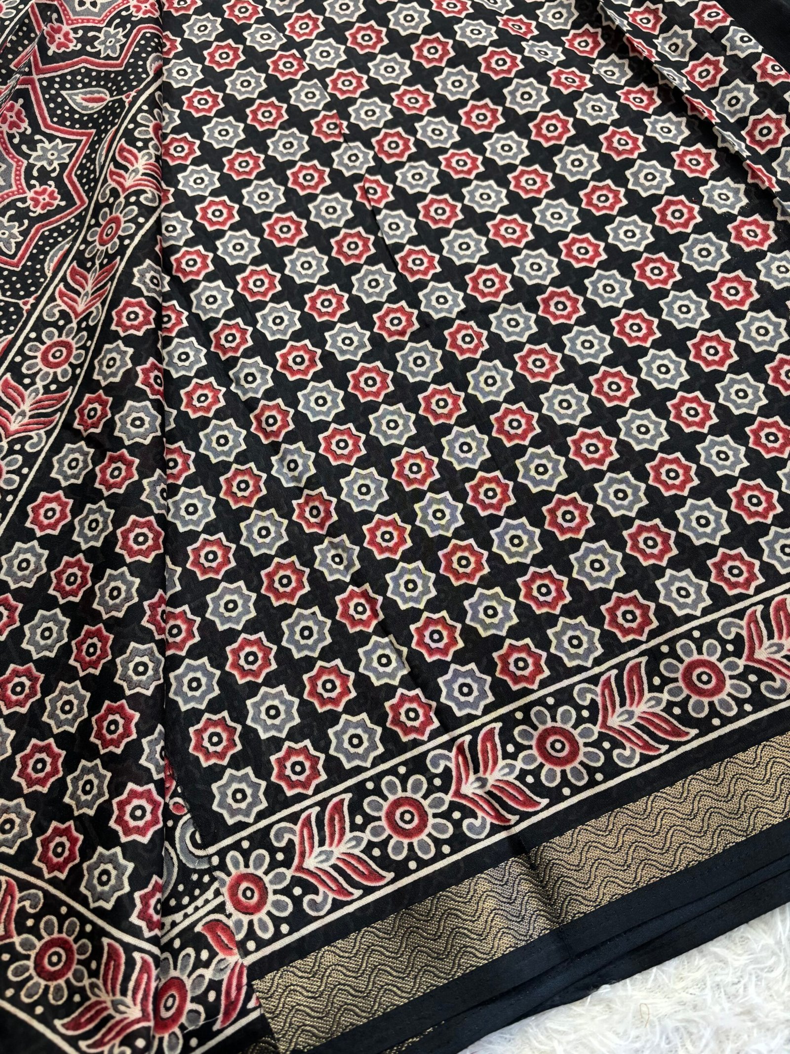 Mul Cotton saree with Ajrakh prints towards the border with beautiful pallu and blouse with prints.