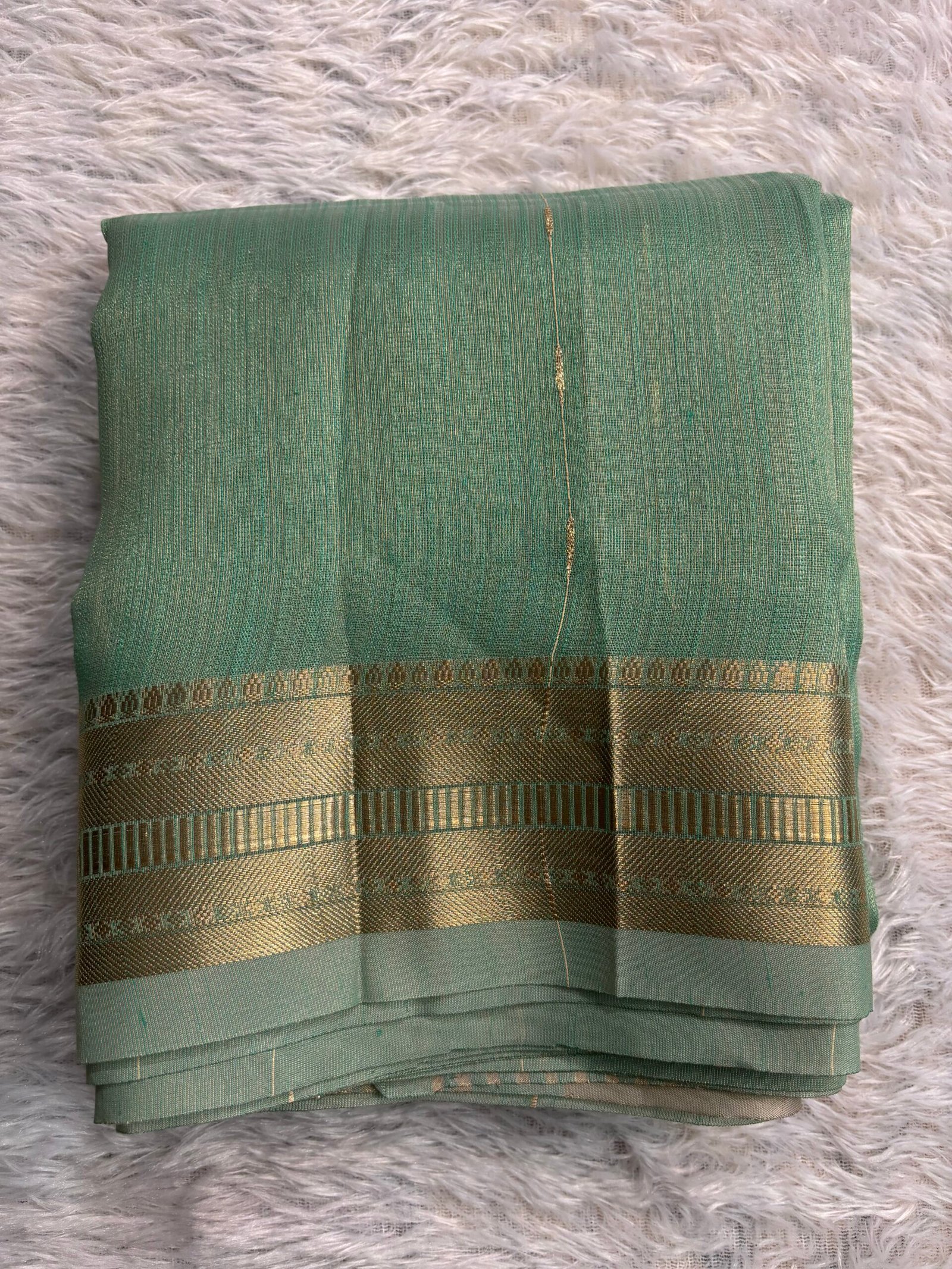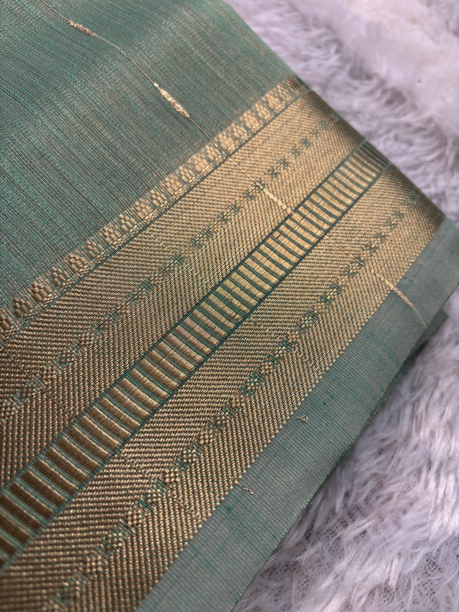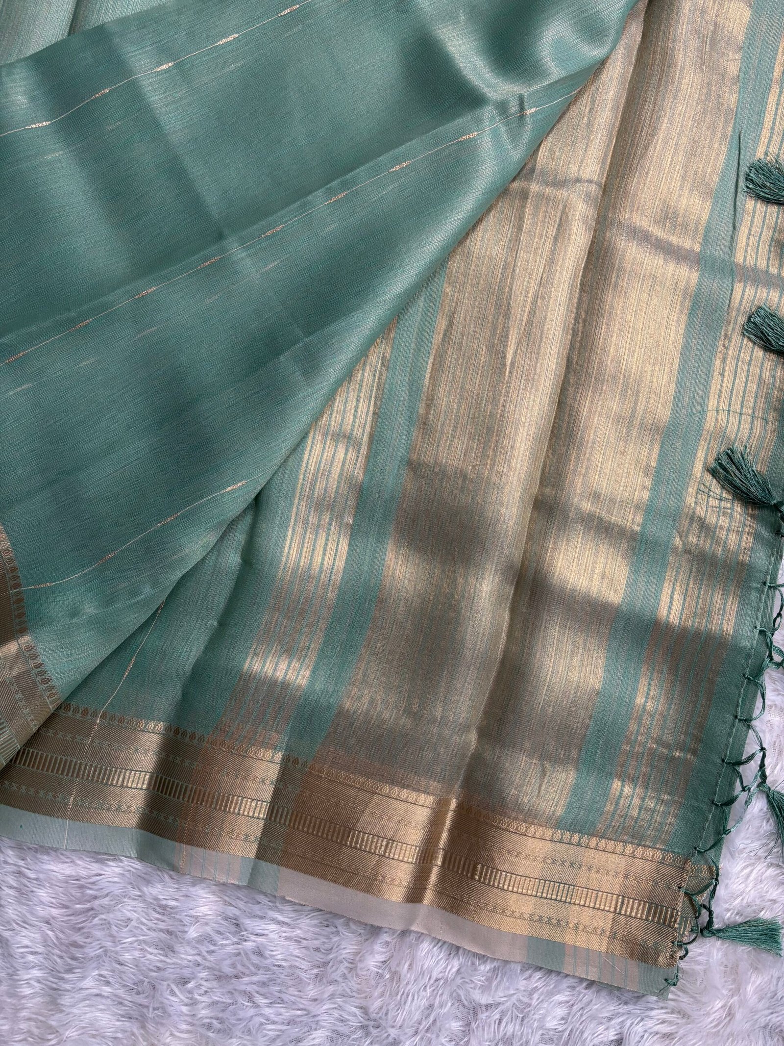 This shimmery dual tone Lenin tissue saree having vertical design in the body with beautiful zari borders. Golden pallu with tassels matches with golden striped blouse which is perfect for small occasions.